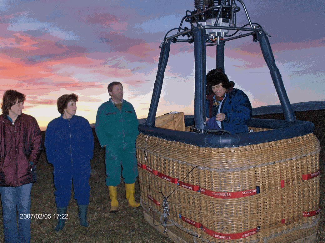 Ringsum nur Berge, Gletscher und Schnee. Für uns wird das Navigieren zunehmend schwieriger. Dabei geschieht es, dass wir beide beim Kartenabgleich und nach schon 6 Stunden Fahrt kurz unaufmerksam werden. Resultat: 2.5 m/s Sinken und unmittelbar darauf die Frage des Controler: what is your intention? Vermeidet man solche Situationen, hält Höhe und hat zuverlässig funktionierende Navigations- und Kommunikationstechnik wird man von den Fluglotsen sehr bevorzugt geleitet. An dieser Stelle deshalb ein großes Dankeschön für die freundliche Unterstützung aus dem „Äther". Wir nähern uns nach 7 Stunden Fahrt den östlichen Alpen. Am Horizont sind in den Schneefeldern schon die ersten dunklen Streifen auszumachen. Slowenien kommt tatsächlich näher. Wir haben zwischenzeitlich wieder Erfolg in einer kurzen Verbindung mit unserem Rückholerfahrzeug. Keine Möglichkeit Stimmungen oder Ratschläge auszutauschen. Position, Geschwindigkeit und nächstes Ziel Klagenfurt. Dann bricht die Verbindung wieder zusammen. Also, Verantwortung bei unseren Frauen. Sie haben zu diesem Zeitpunkt Salzburg noch nicht erreicht. Damit keine Raststätte und maximale Geschwindigkeit…. Der Controler fragt nun immer häufiger nach unseren Ressourcen und unserem Ziel. Ljubljana wird sicher nicht erreicht werden können aber Maribo liegt in unserer Drift. Wir haben noch genügend Gas, doch der Sonnenuntergang rückt näher. Dann die einzig betrübliche Mitteilung aus dem Funk während der gesamten Fahrt: „you are not cleared for the next sector!" Also Landegebiet suchen. Abstieg und auf „Rauchzeichen" zur Windrichtungs- sowie Geschwindingkeitsabschätzung am Boden achten. Obwohl wir eben noch mit knapp 90 km/h unterwegs waren, ist in Bodennähe faktisch Windstille. Wir treffen in einem hügeligen Gelände auf ein größeres Waldgebiet und schleichen zu einer Wiese auf einer Bergkuppe. In der Nähe ein Bauernhof. Nun ist es nur noch die obligatorische Telefonfreileitung, die uns zu voller Konzentration zwingt. Das letzte Hindernis ist überwunden, der Parachutezug erfolgt und der Korb kommt auf der leicht abschüssigen Wiese zum Stehen. Da wir unmittelbar neben der Strasse gelandet sind, finden sich die ersten Besucher schnell ein und bewundern den riesig anzuschauenden, silberfarbenen