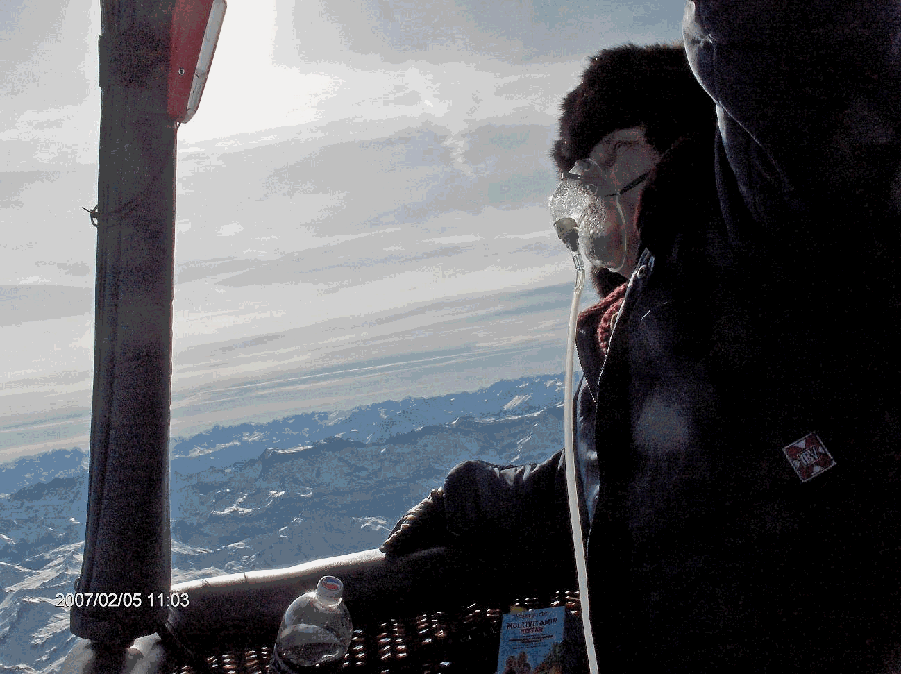 Blick nach Nordosten, die Zugspitze grüßt. Im Norden erkennen wir deutlich den Bodensee. Die Allgäuer Berge liegen in der Sonne und Obersdorf spart offensichtlich dieses Jahr die Schneeräumungskosten. Nur die Großschanzen sind als weiße Punkte in der Landschaft auszumachen. Wir haben mit dem breiten Rheingraben die letzten guten Landemöglichkeiten hinter uns gelassen und befinden uns über Vorarlberg. Die Controlerstimme hat wieder gewechselt. Geblieben ist auch bei dem Herrn in Innsbruck das Problem im Verständnis unserer „Destination: Ljubljana". Die Nord / Süd Drift von Heißluftballonen ist ihm geläufig aber nach Osten? Offensichtlich ist dadurch die mit zweifelndem Unterton gestellte Frage ausgelöst: please confirm typ of Aircraft. Und dies trotz des vorliegenden Flugplanes… Nachdem wir als Heißluftballon identifiziert werden, was er selbst später mit einem Blick aus dem Kontrollturm in Innsbruck zweifelsfrei bestätigen kann, da wir den Platz in Sichtweite überfahren, haben wir wieder eine sehr gute Betreuung. Unter uns sind nun die bekannten Skigebiete in Tirol. Die Pisten erscheinen prächtig präpariert. Die Skifahrer bevölkern Ameisen gleich die hochgelegen Abfahrtsstrecken. Wir fahren unmittelbar am Großglockner vorbei.